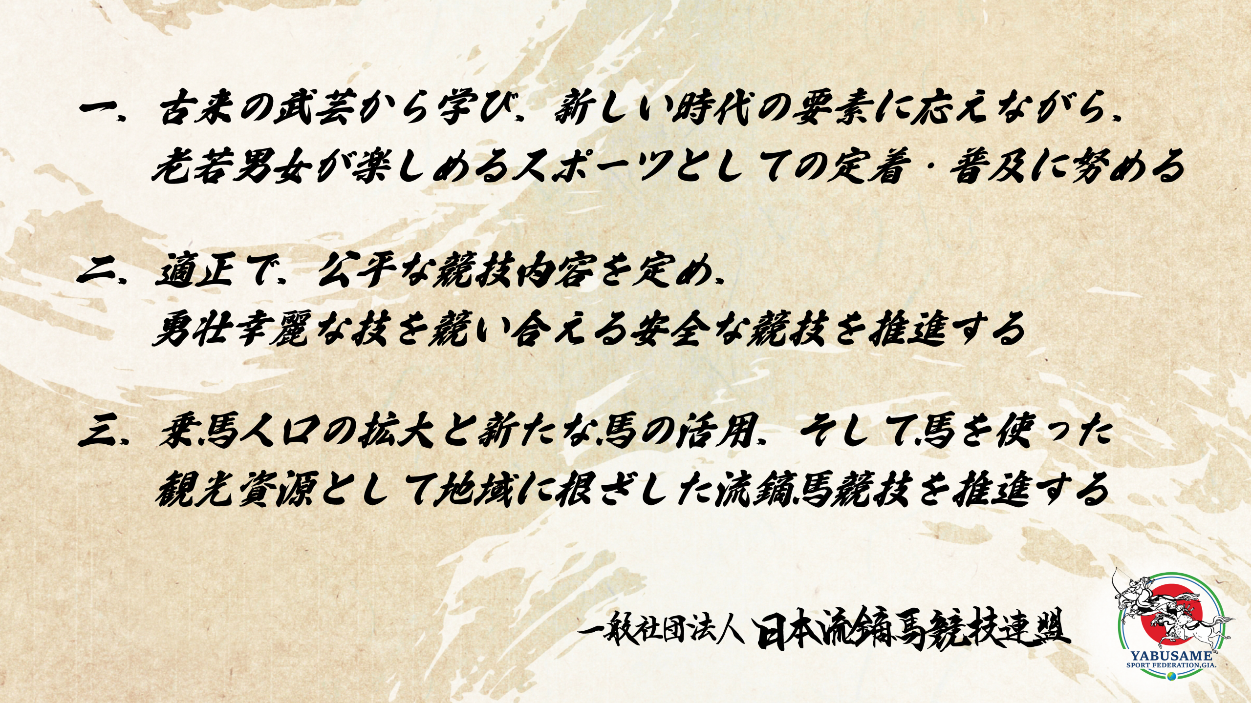 競技流鏑馬は、日本の伝統武芸である流鏑馬を礎としながら、現代社会にふさわしいスポーツとして発展してきました。その歩みの中で、私たちは次の三つを大きなテーマとして掲げています。 一、古来の武芸から学び、…